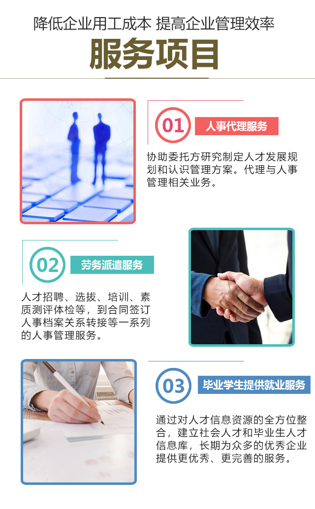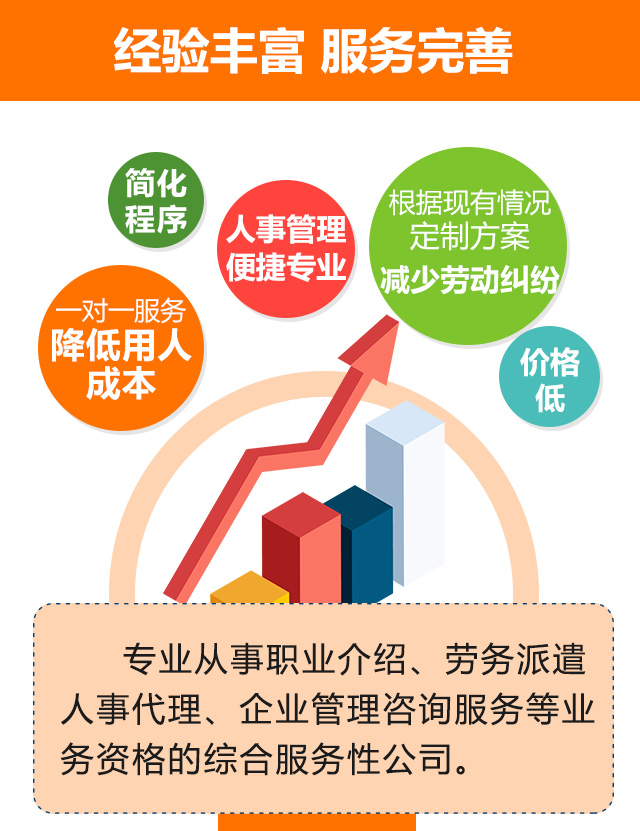 公司专业从事劳务派遣、劳务外包;人力资源外包等业务,立足长春,面向全国。集网络媒体、传统媒体和先进的信息资源渠道于一体,为客户提供全方位的人力资源服务,使企业的人力资源管理适应其总体发展战略。公司为社会务工人员和各所高等学校以及大中等职业技术学校的毕业生开拓新的职业生涯。公司凭借高效的服务、先进的技术、专业的团队,促进人才职业发展,以实现毕业生职业生涯规划。我们将竭诚地为企业寻求更好的人才。我们一直致力于开发更多人力资源,通过对人才信息资源的全方位整合,建立社会人才和毕业生人才信息库,长期为众多的优秀企业提供更优秀、更完善的服务。